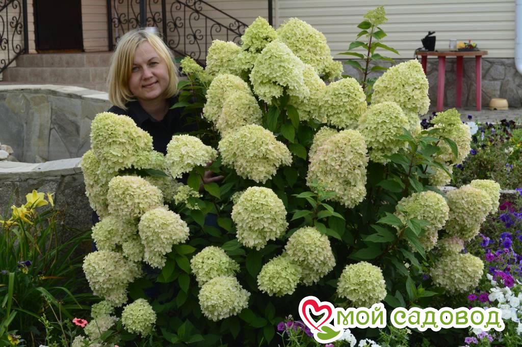 соцветия большие 30-35 см, плотные, при распускании цветов зеленоватые, потом их окраска меняется на лаймово-белую, а ближе к осени возможно добавление розоватых оттенков;